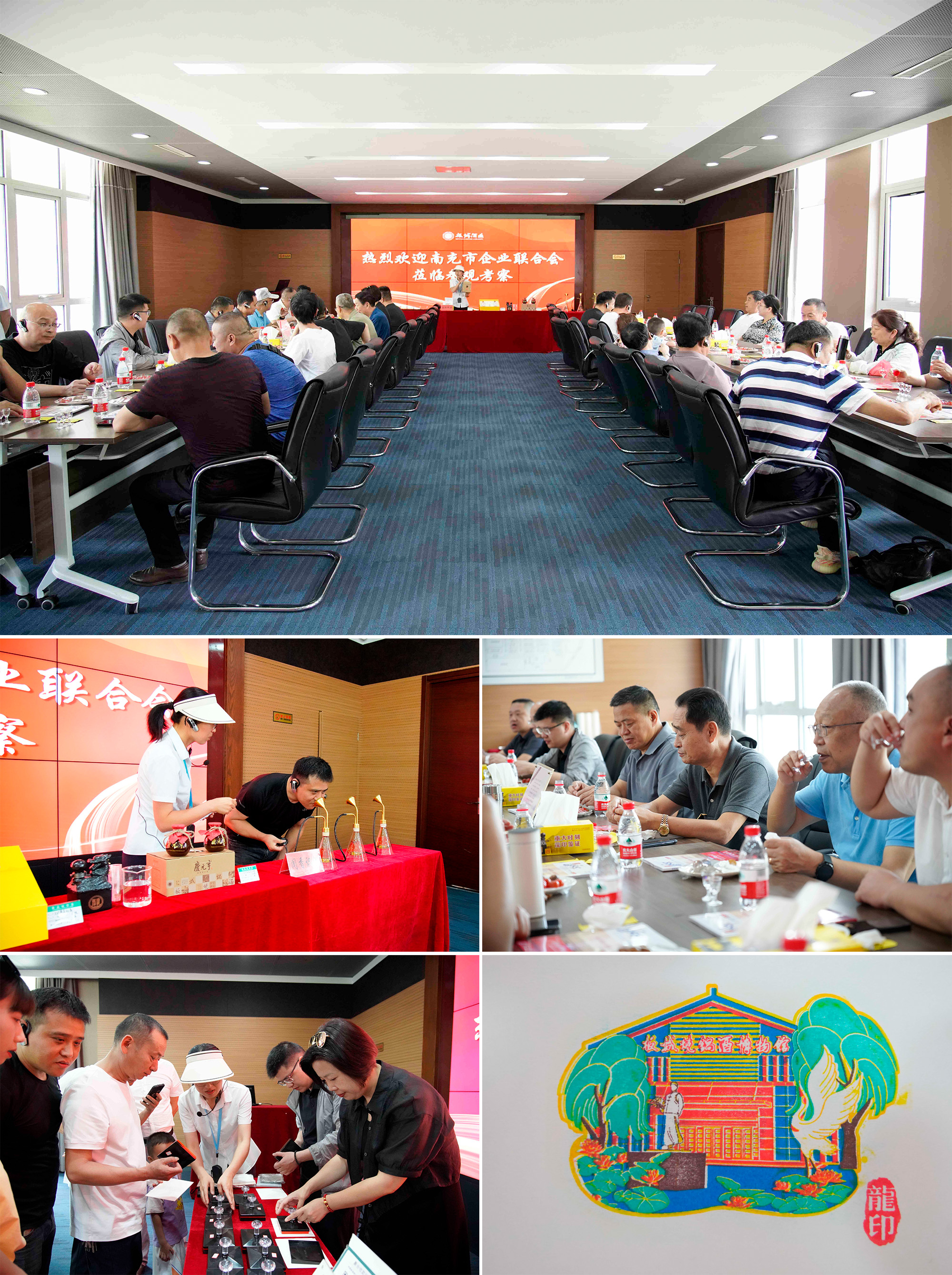 品味板城美酒,參與互動體驗,板城酒博園的講解員為旅行團(tuán)一行現(xiàn)場講解白酒的文化知識,并帶領(lǐng)現(xiàn)場人員進(jìn)行有獎互動,通過“聞香識酒”活動來辨別不同白酒的香型,對不同香型的美酒進(jìn)行品鑒,感受不同白酒酒體的味道與特點。最后,來訪旅行團(tuán)現(xiàn)場體驗“板城燒鍋酒博物館套印印章”文創(chuàng)產(chǎn)品制作過程。旅行團(tuán)在感受白酒文化魅力的同時,并購買相關(guān)白酒產(chǎn)品,收獲一份佳釀。